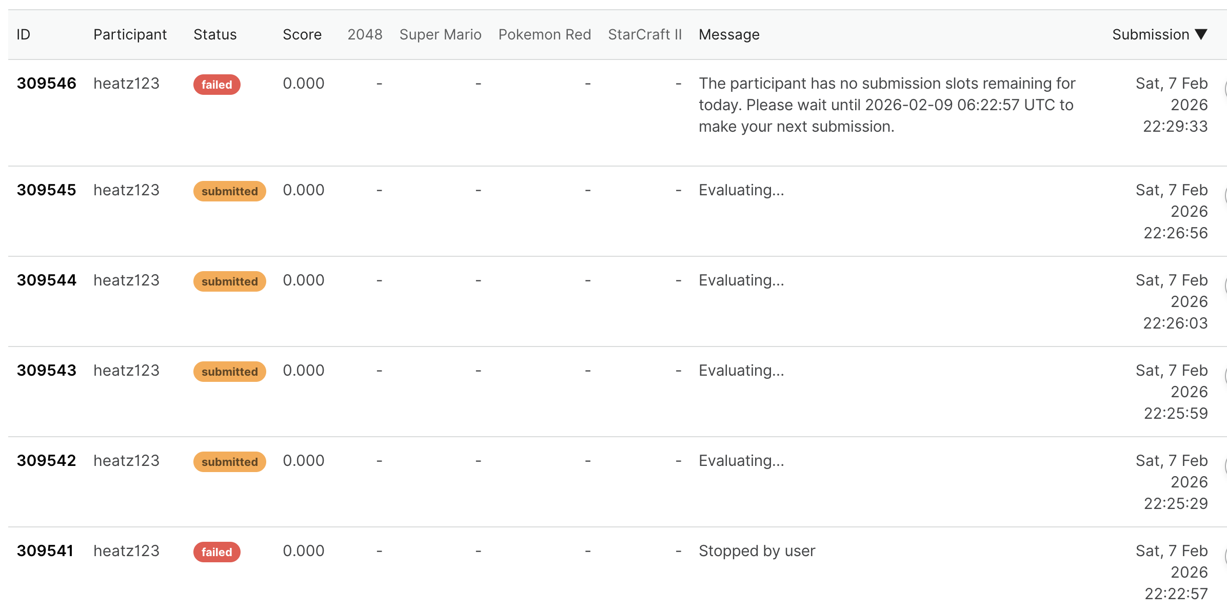 Today I hit the daily submission limit because several submissions were unintentionally sent within a few minutes, likely due to a network issue. They were not intentional, and they all appear to have failed / be failing evaluation.