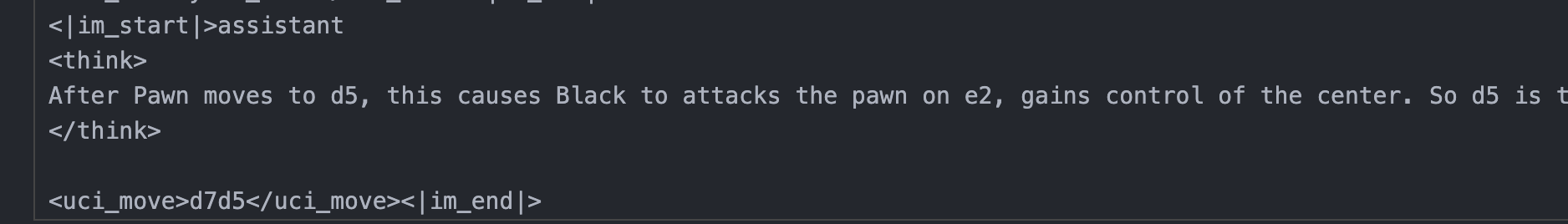 finish_reason=length~100%, completion tokens always hit the cap,<uci_move>rate ~25% - Outputs often look corrupted/garbled (binary-ish text), leading to resignations and ACPL ≈ 864+